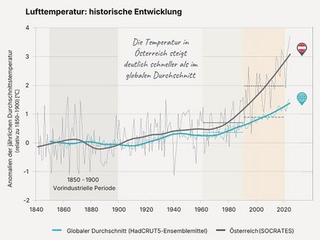 [[Datei: Durchschnittstemp. historische Entwicklung Huppmann et al 2025.jpg |thumb|upright=1.5|right|Historische Entwicklung der jährlichen Durchschnittstemperatur - globaler Mittelwert und Österreich. Quelle: Huppmann et al. 2025.]]Im Vergleich zur vorindustriellen Periode (1850 bis 1900), hat sich die globale Mitteltemperatur um 1,4 °C erhöht, in Österreich betrug diese Temperaturzunahme im Mittel jedoch bereits 3,1 °C [8]. Diese klimabedingte Temperaturerhöhung führt zu vielfältigen Folgen. So steigt die Verdunstung von Wasser aus der Tier- und Pflanzenwelt sowie von Boden- und Wasseroberflächen (sog. Evapotranspiration) durch eine Erhöhung der Temperaturen. In Mitteleuropa erhöhte sich die Evapotranspiration von 1960 bis 2010 beispielsweise um 5 bis 15 % bei gleichbleibenden oder abnehmenden Niederschlägen. | |||