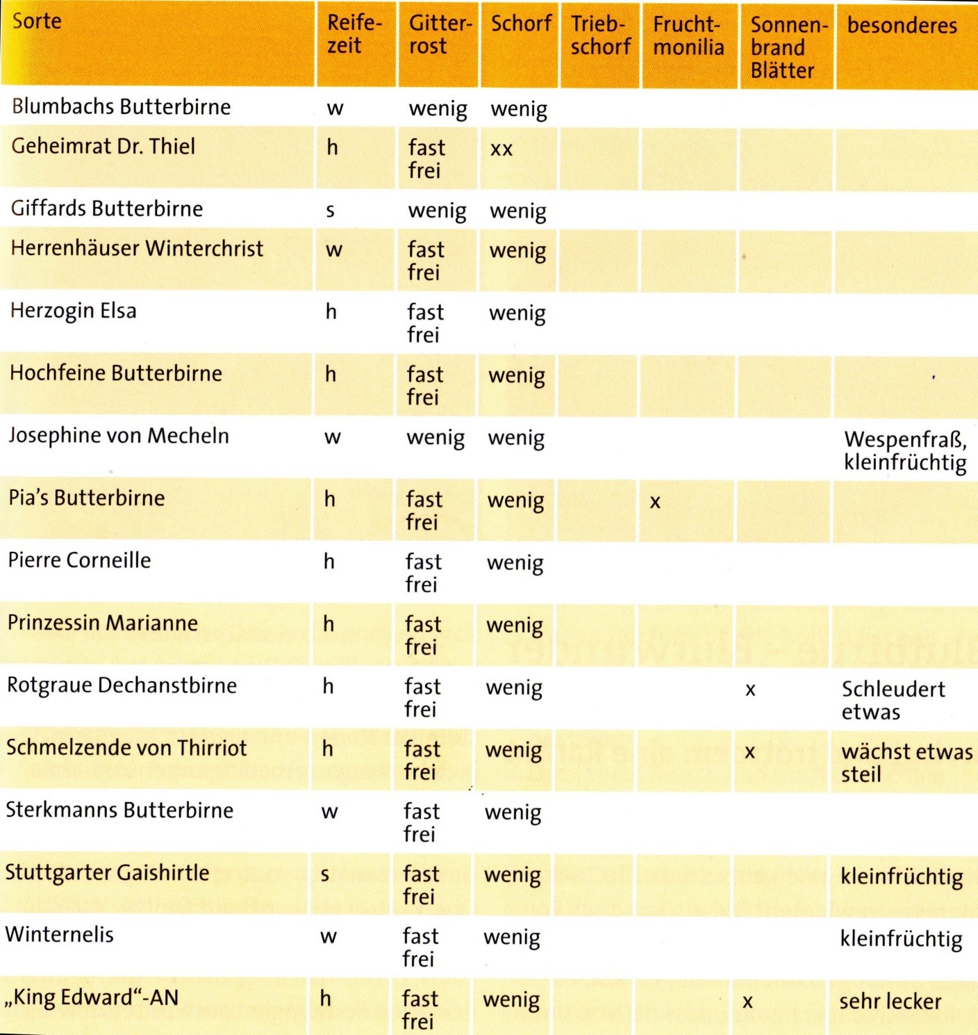 Empfehlenswerte Tafelbirnensorten. Quelle: Bade, J. (2019): Tafelbirnen. Krankheitsanfälligkeit beim Standard-Sortiment und Alternativen. In: Pomologen-Verein Jahresheft, 74-79.
