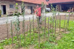 3,5-jähriger Apfelbaum aus Direktsaat. Der Baum ist bereits veredelt. Die Zuwächse von Sämlingen ohne Wurzelschnitt sind enorm, obwohl hier keine Düngung erfolgte und der Standort (Braunerde, 24 Bodenpunkte) auf 820 m Seehöhe liegt (© OIKOS 2025).